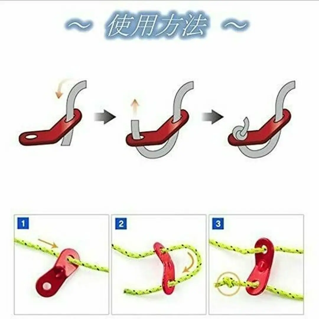 自在金具を横から見て「く」の字の内側上部の穴にガイロープを通し、下部の穴に外側から内側に向けて通しロープ先端を結びます。「く」の字の外側に出たガイロープをペグなどにかけた後に長さを調整しましょう。
