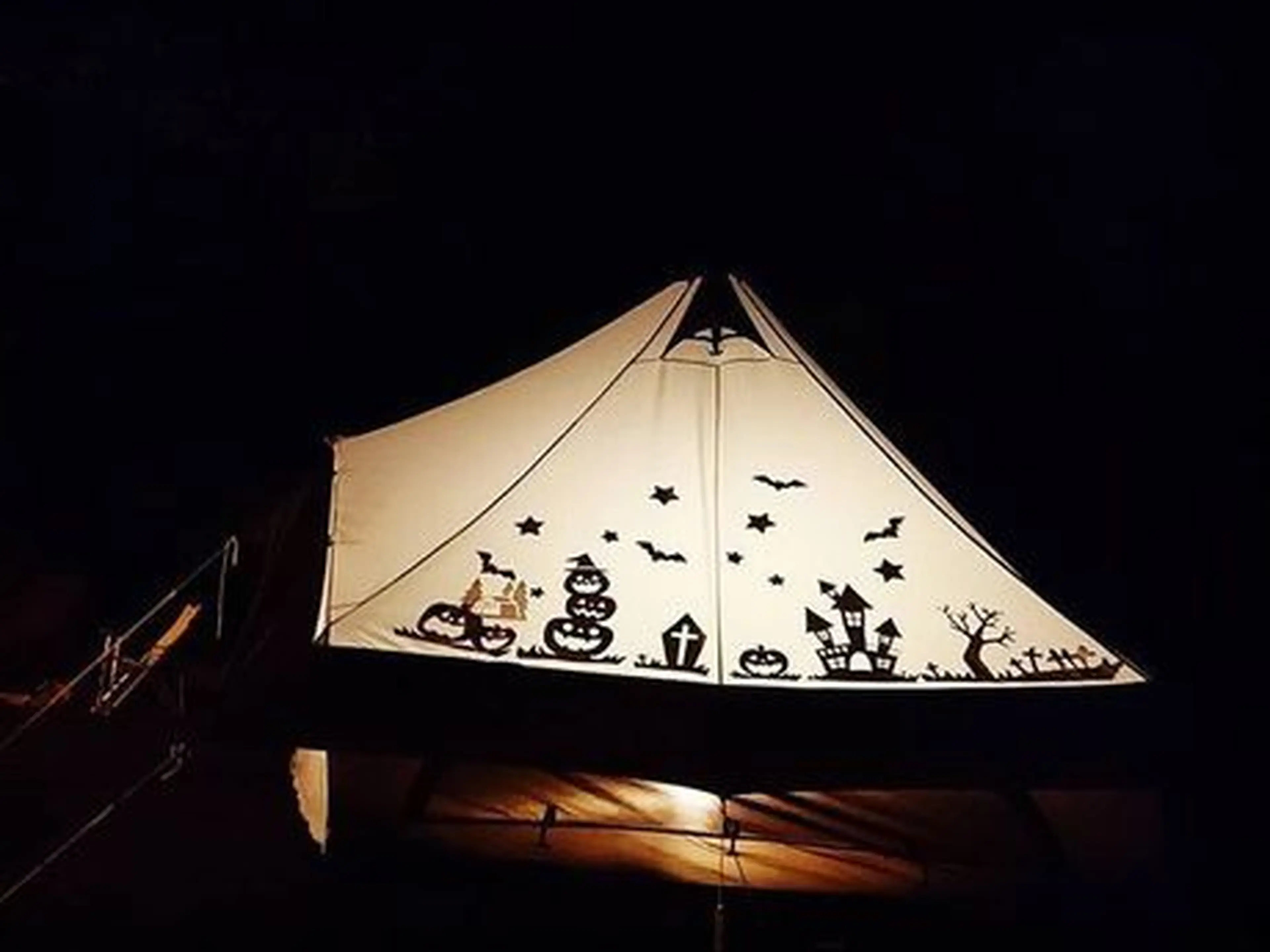テントの中でランタンを灯すとテントにハロウィンのシルエットが!子供も喜ぶこと間違いなしの、これ以上ないサプライズですね!テントはogawaの「グロッケ12T/C」を使用しているそうです。