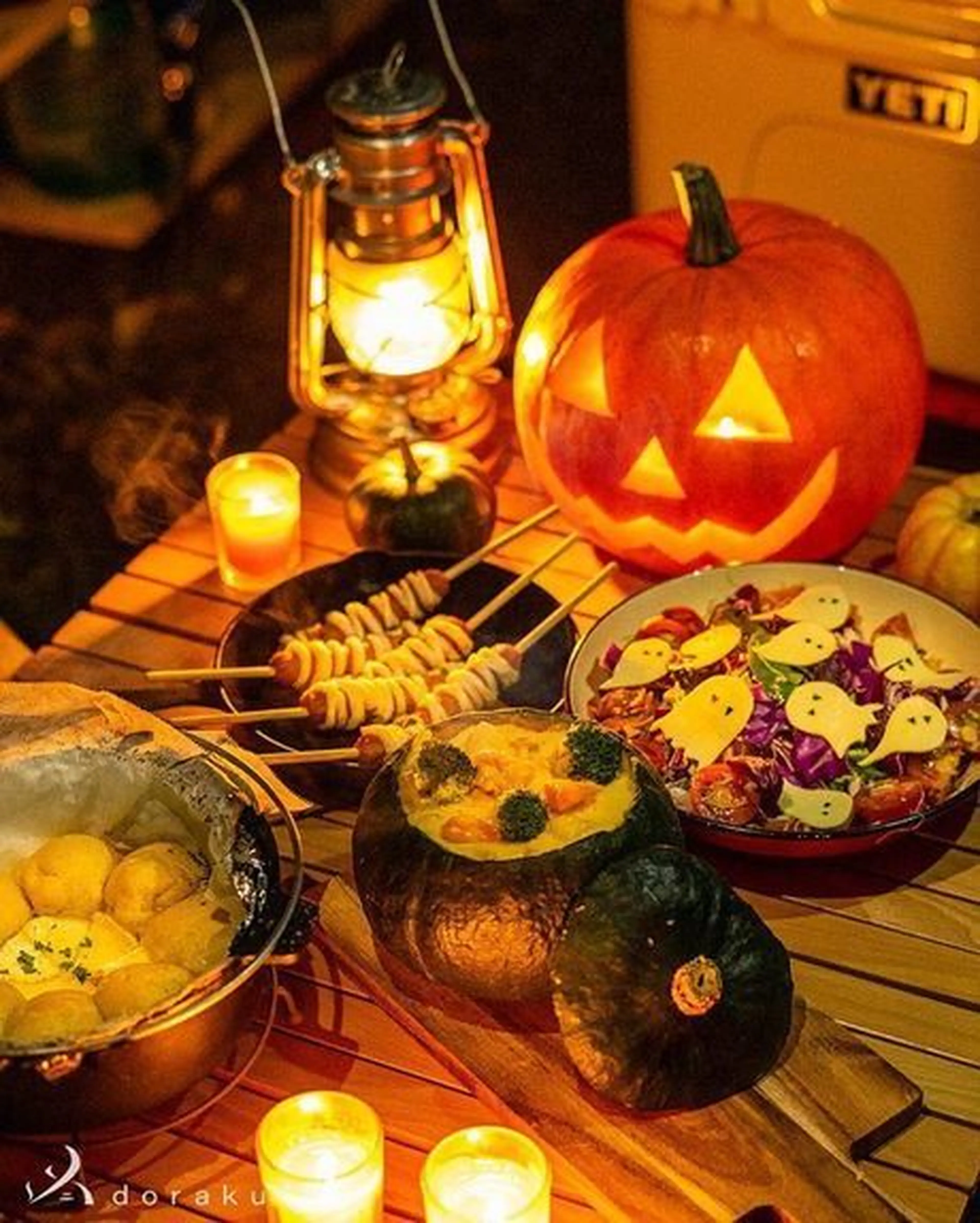 @doraku011さんは、「少し大人なハロウィンキャンプ」を意識。料理の一つ一つが上品な仕上がりになっていました!手作りのジャックオーランタンも注目ポイント。時間がたつとどんどんしおれ、表情が変わっていくそうです。変化を楽しみながら美味しい料理をいただく、なんとも贅沢な時間です♪
