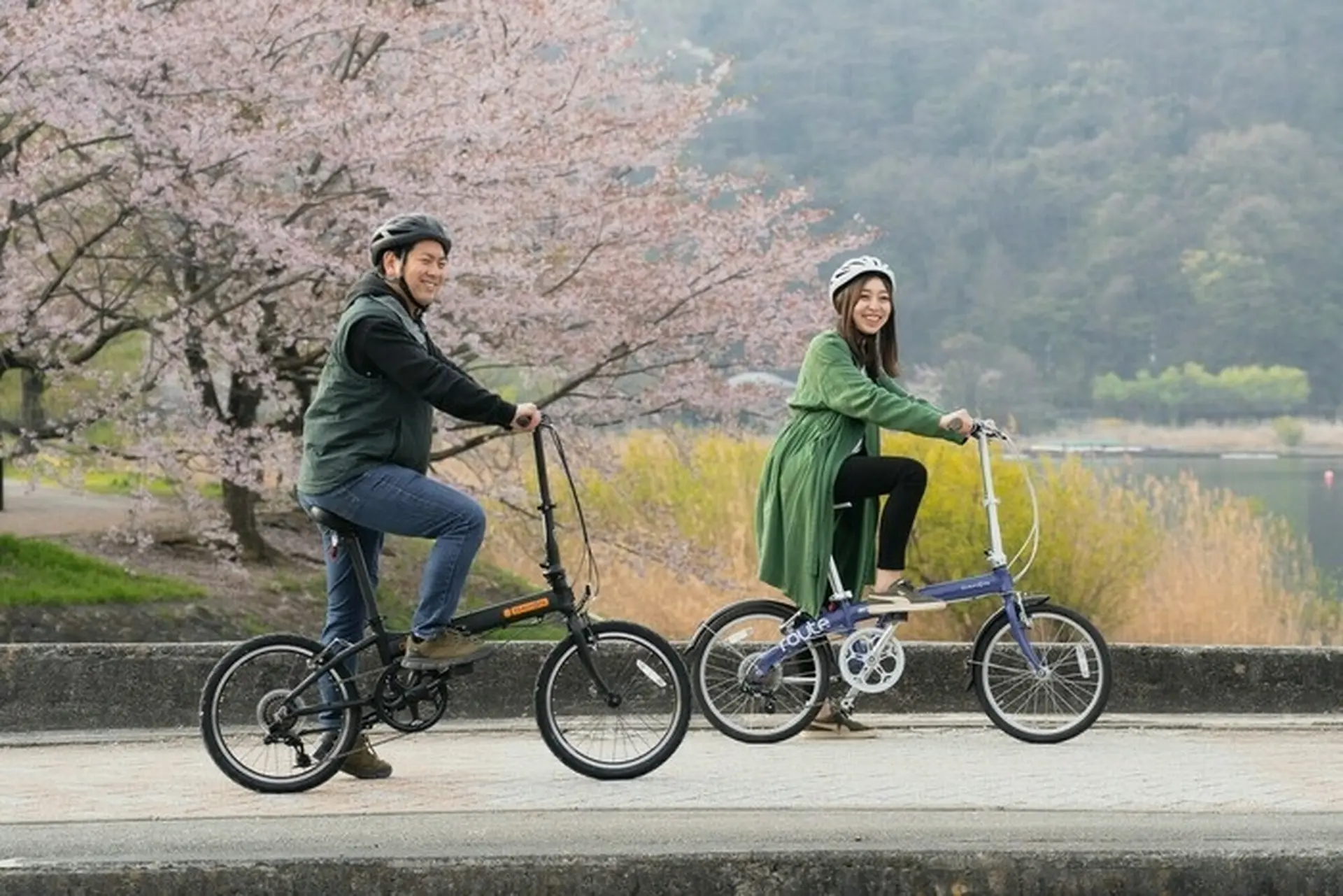 ポタリングを楽しむめに訪れたのは、自然の魅力があふれるリゾートタウンの山梨県河口湖町。富士山の北麓に位置する湖畔沿いのキャンプ場をチョイスしました。テントを張って小休憩を挟んだら、車から折りたたみ自転車を降ろして、さっそく周遊へと出かけます。
