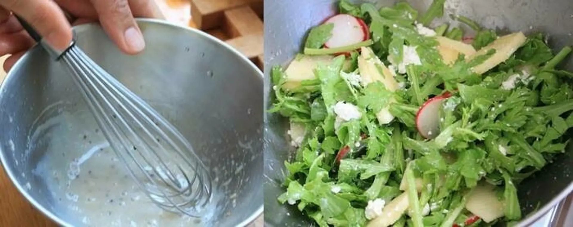 ③砂肝の入っているボールにサラダ春菊、りんご、カッテージチーズを入れて和える。お皿に盛り、ドレッシングをかけ、ガーリックトーストを添えて完成