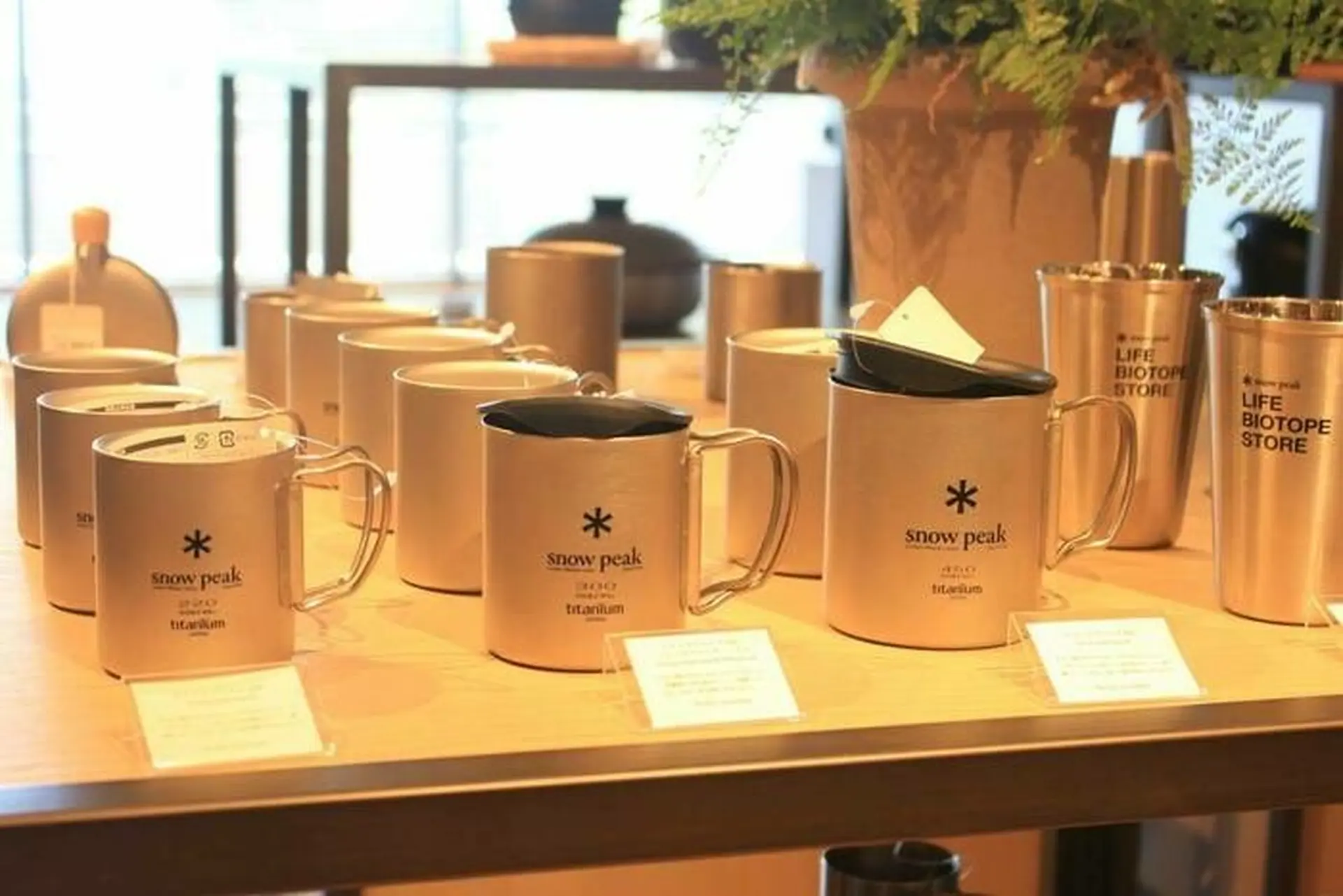 LBSの一番の売れ行きは、スノーピークのロングセラー、チタンマグシリーズ。軽量・頑丈さ重視のシングルウォールと、保温・保冷性に優れているダブルウォールの2種類。そのシンプルなフォルムとこだわりのサイズ展開により、世界中のアウトドアファンに愛用されている商品です。