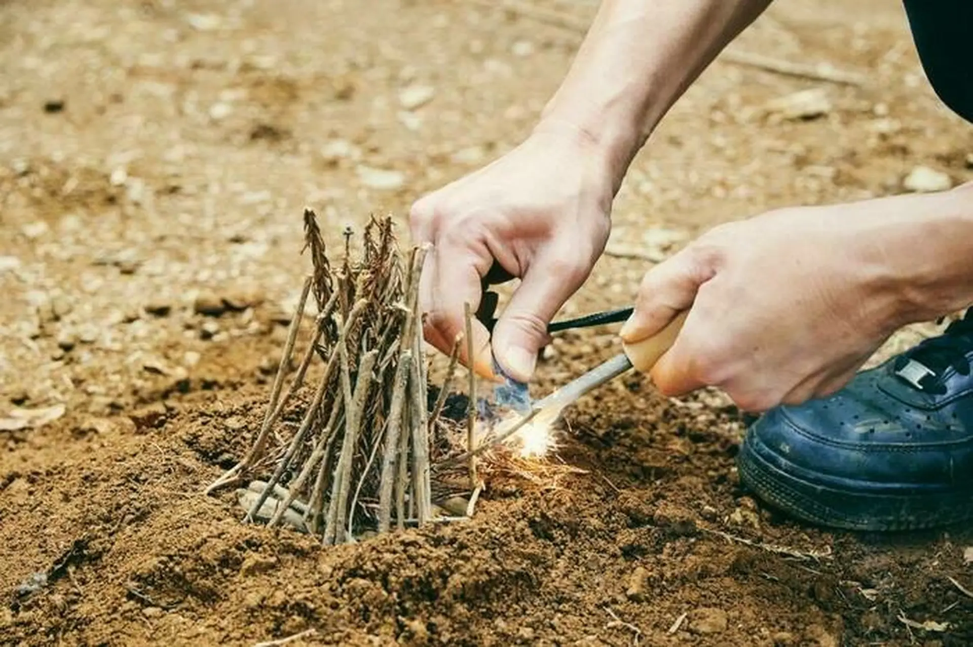 ここまで準備できたら、いよいよ着火!マッチでもいいですが、ファイヤースターターなどの道具で火おこしするのも、より原始的で楽しいです。小学生くらいになると、ファイヤースターターも上手に扱えますよ。