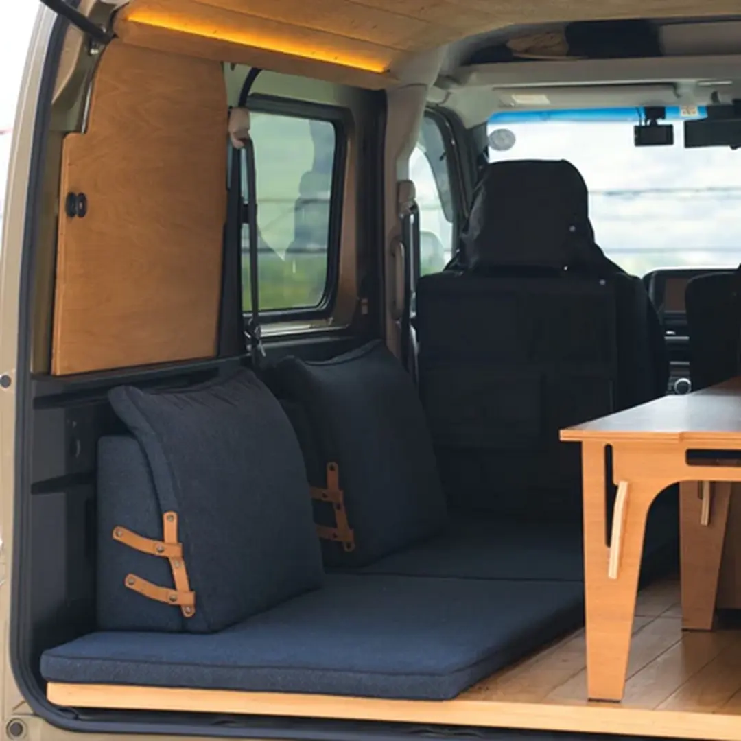実はこちら、製造元はソファメーカー。このバンライフソファも、就寝時以外はソファに大変身します。まるでインテリアのようなデザインで、、広げたままでもだらしなく見えないのがうれしいポイント!